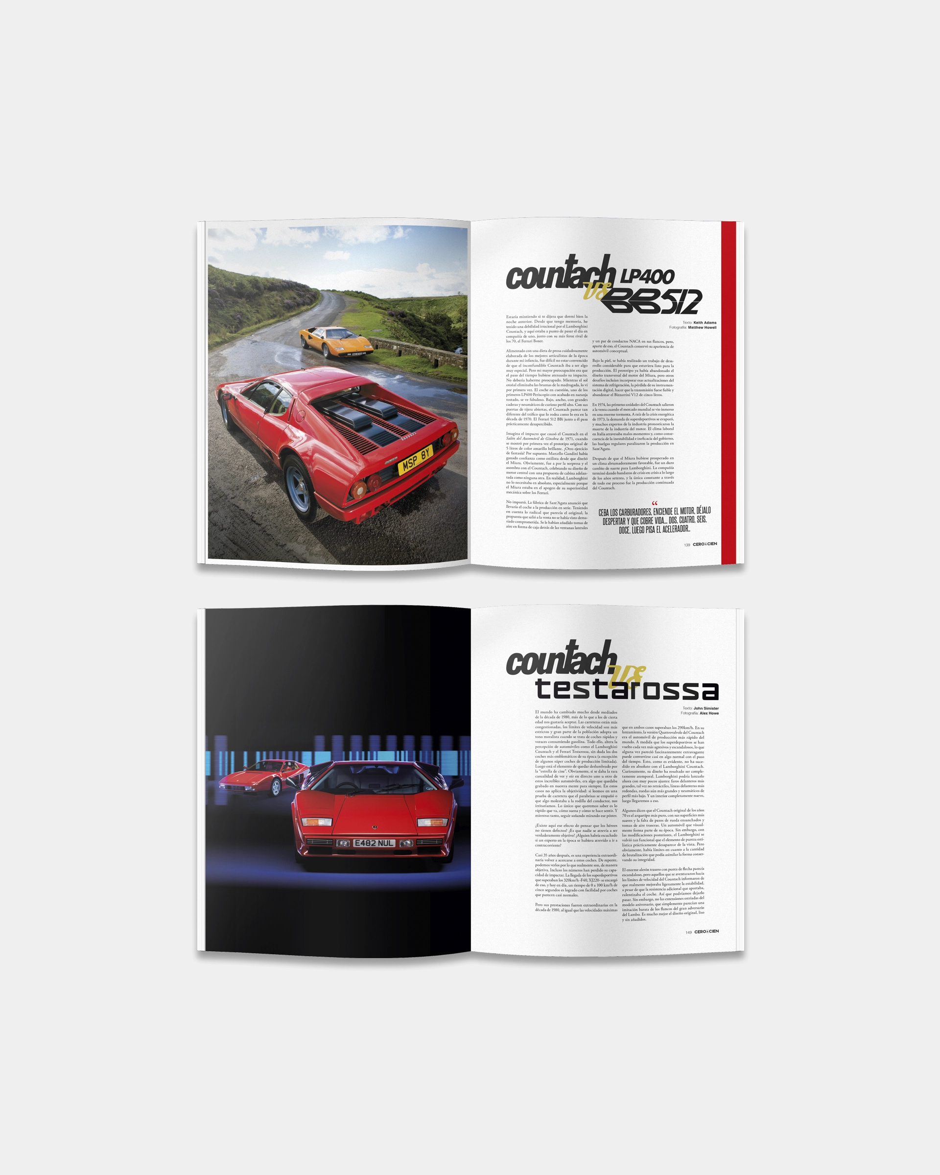 En este número 1, el tema principal son una serie de artículos relacionados con el Lamborghini Countach. Sin ninguna duda, uno de los modelos más míticos jamás construidos, que bien merecía este despliegue de contenido, incluyendo un pequeño recorrido a lo largo de la historia de Ferruccio Lamborghini, un detallado reportaje de las diferentes versiones fabricadas y un par de comparativas con modelos contemporáneos de Ferrari. Un gran número de páginas, acompañadas de un material gráfico extraordinario.