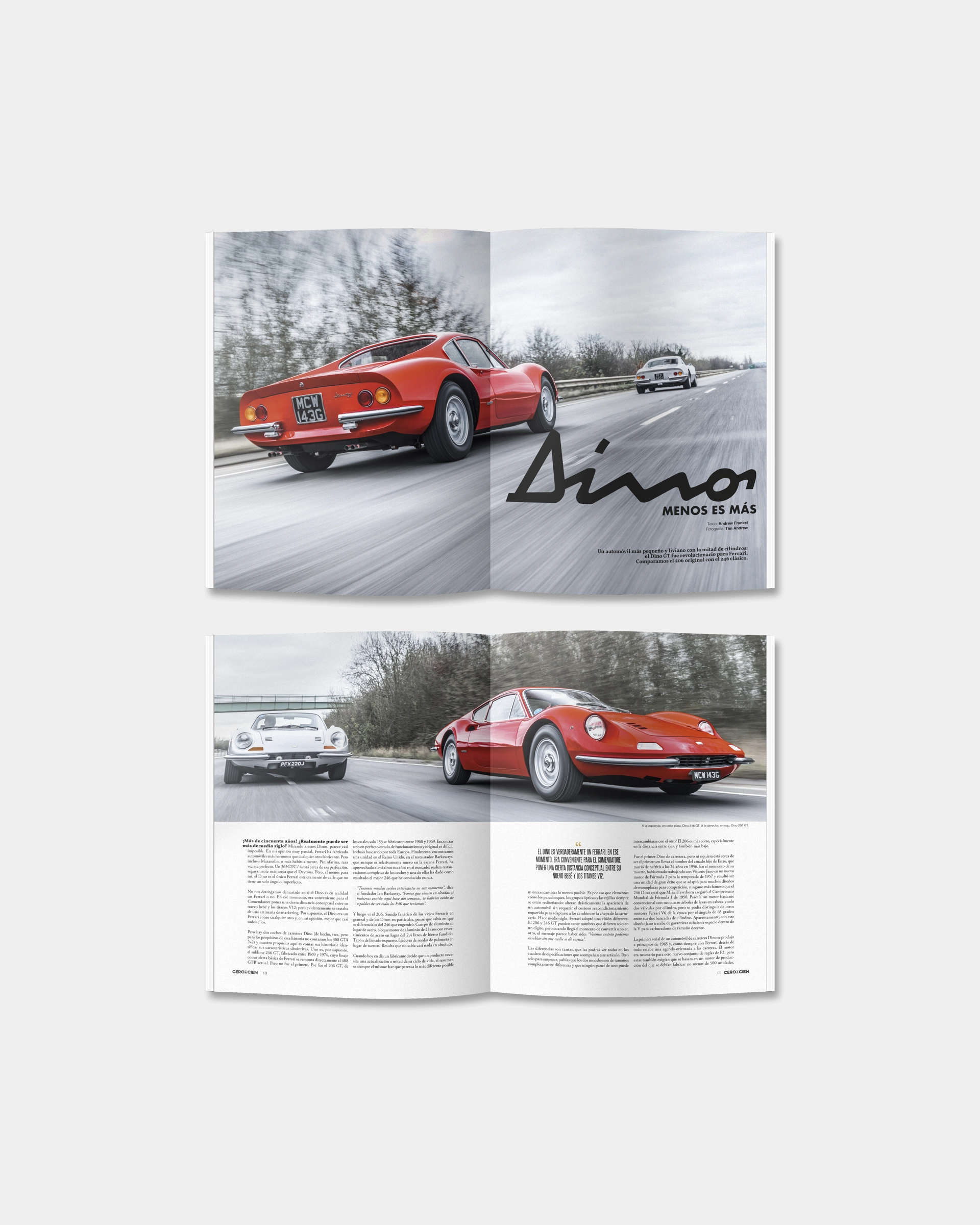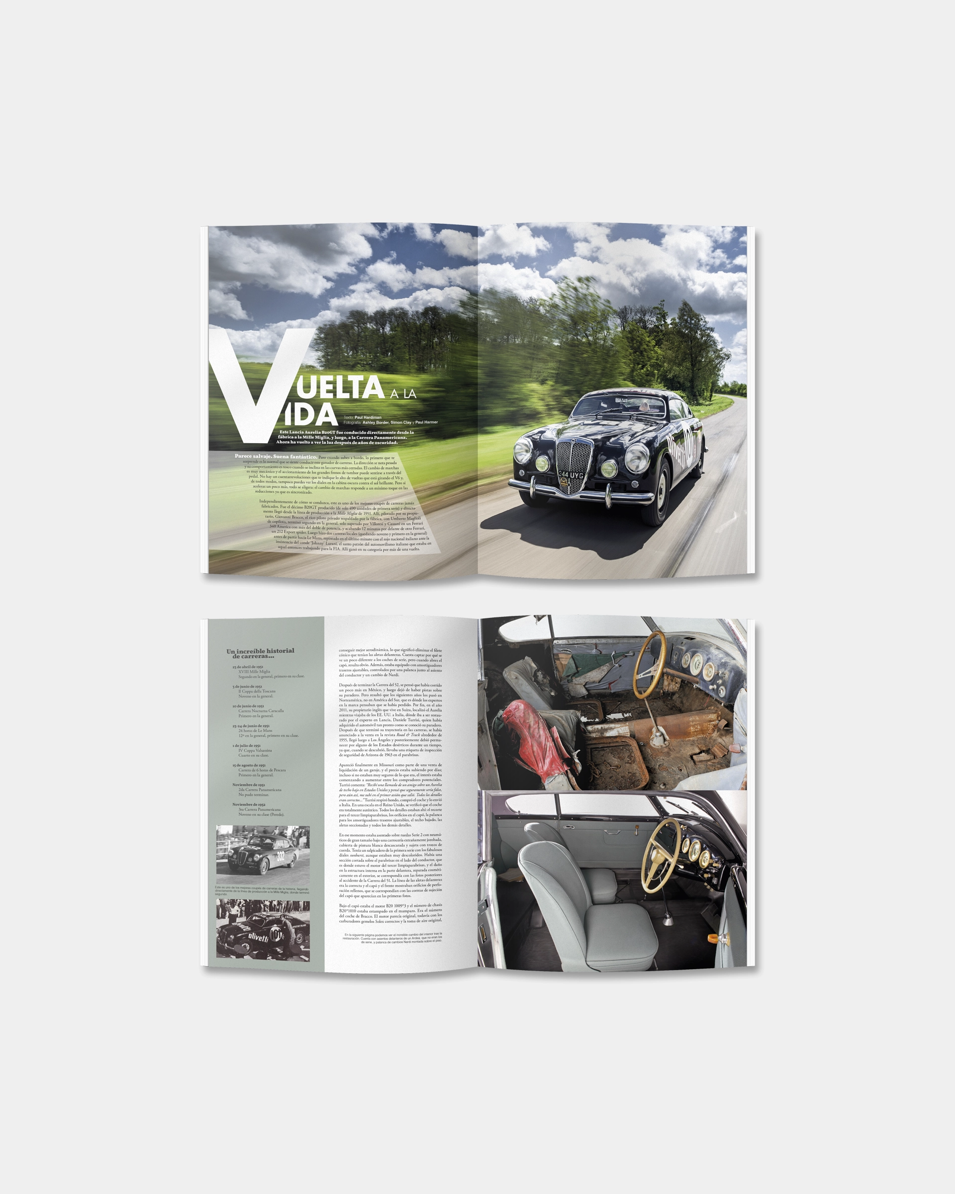Otro reportaje muy significativo es el que compara el Dino 206GT con el posterior 246 GT, acompañado de un extraordinario reportaje fotográfico. También rendimos homenaje a una fantástica restauración de un Lancia Aurelia B20GT Coupé de 1951 que fue directamente de la línea de montaje a la Mille Miglia, ganando en su clase.