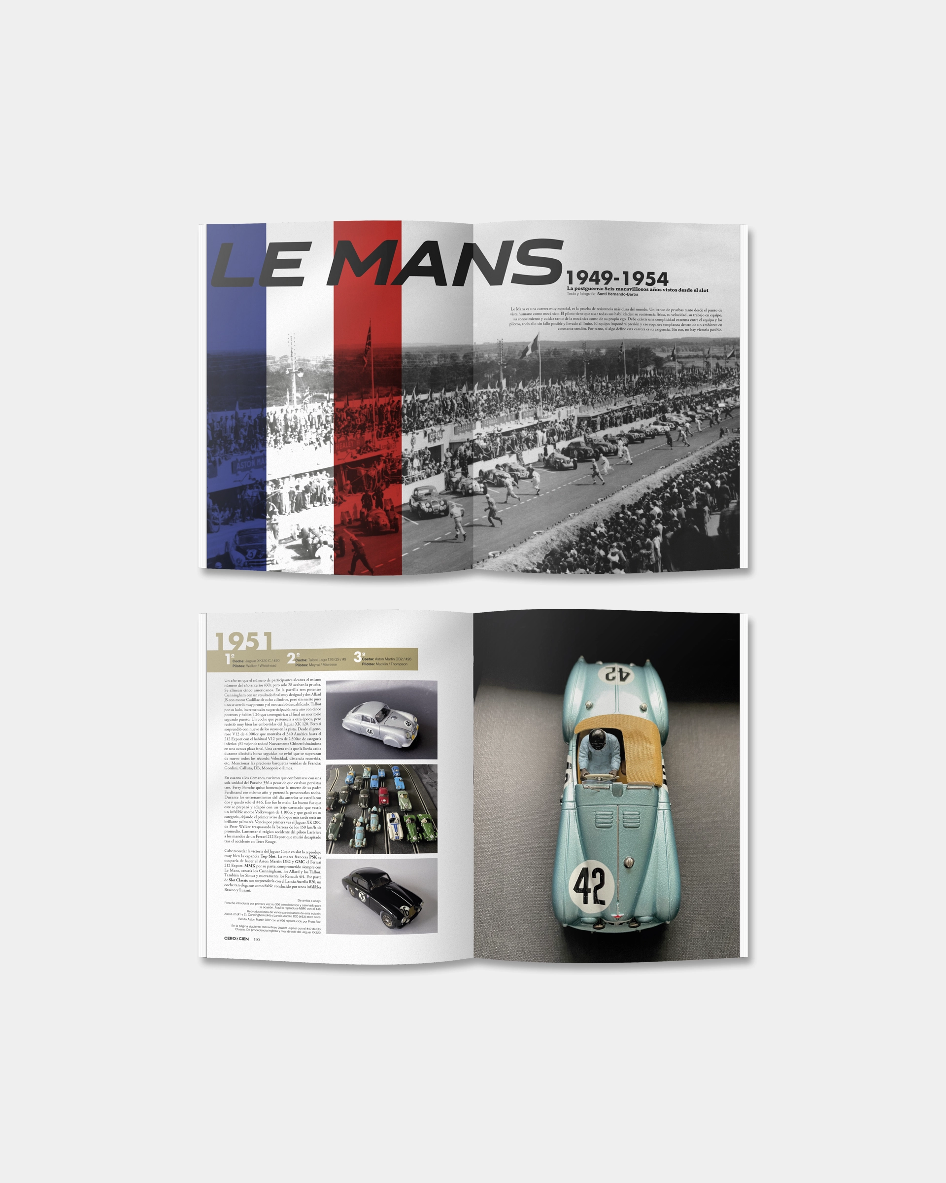 En coleccionismo , hacemos un recorrido a través de reproducciones de slot a los seis años de gloria en el Le Mans de la postguerra, reproduciendo las parrillas y ganadores de cada uno de los años. Nos acercamos también al arte de Belin y Dave que han unido esfuerzos para crear un casco que termina siendo una verdadera obra de arte.