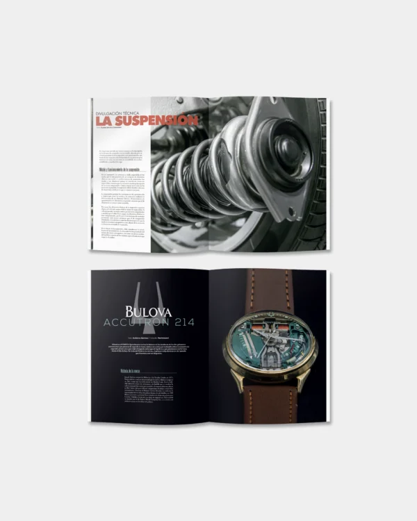 En nuestra sección de divulgación técnica, descubrirás todo lo que necesitas saber sobre las suspensiones. Y en otro de los artículos, la ruta elegida en este número es la de Oporto a Lisboa, en Portugal. Una de esas rutas que quedan grabadas para siempre en nuestra retina por la riqueza de su historia, gastronomía y espectacularidad de sus paisajes. En arquitectura, le llega el turno a uno de los grandes, Richard Neutra, creador de la fascinante casa Trementine. Y el reloj que reseñamos es el Bulova Accutron 214, junto a la extraordinaria historia de la marca.